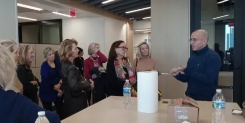 On January 16, members of the Phoenix chapter watched neurosurgeon Nader Sanai remove a tumor from a 71-year-old woman’s brain (with her prior permission, of course) ever so delicately over the course of an hour. We could see what the surgeon saw--we were able to look through the operating microscope and see the brain pulse with every heartbeat—and we asked questions as he explained his actions. When the tumor he had carefully loosened finally came out, we heaved a sigh of relief. And we applauded. Dr. Sanai, above right, is one of the leaders at the Barrow Neurological Institute (BNI) in Phoenix, which does the highest volume of brain tumor surgeries in the United States, third highest in the world. Barrow doctors developed innovative procedures that have improved the efficiency and effectiveness of the procedure. (Three of those surgeons’ wives are members of the Phoenix Chapter: Penny Papadopoulos, Lynn Sonntag, and Nancy Spetzler. Another member, Sharon Ponce, is the mother of a BNI surgeon.) We watched the operation on a giant screen that filled one wall of the Eller Telepresence Room downstairs from the operating theater. The Telepresence Room, an innovation in operating room communications as well as medical education, was developed with support from Karl and Stevie Eller. Stevie, a member of the Phoenix Chapter, told us how her late husband became determined to use cutting-edge technology to enable visiting doctors and medical students, among others, to see and learn better. Since the Telepresence Room’s first installation decades ago, the system has been modernized four times, and it will be renovated again as technology continues to change.