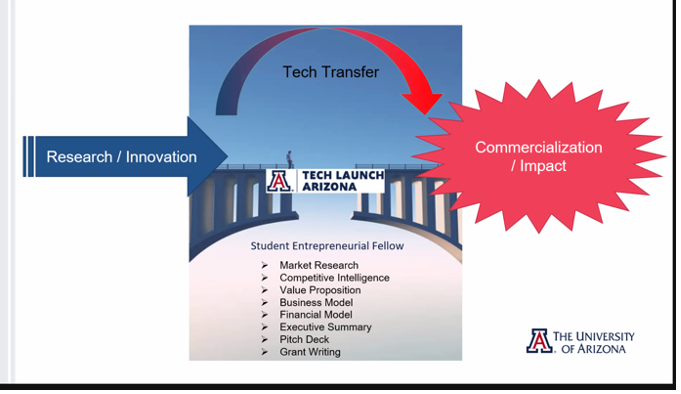 We thank Dorian Voorhees, Associate Dean, Graduate College, for her assistance is planning this Zoom event. Dr. Andrew Carnie welcomed us and acted as moderator. Bruce Burgess, Director, Venture Development, Tech Launch Arizona, spoke to us about Tech Launch where students gain practical start-up company and technology commercialization experience.